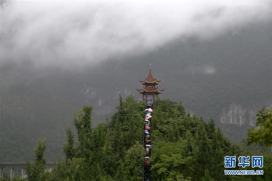 6月27日,游客冒雨游览重庆市黔江区芭拉胡景区。 据文化和旅游部公布的端午小长假旅游统计数据,6月25至27日,全国累计接待国内游客4880.9万人次,累计实现国内旅游收入122.8亿元。 新华社发(杨敏 摄)