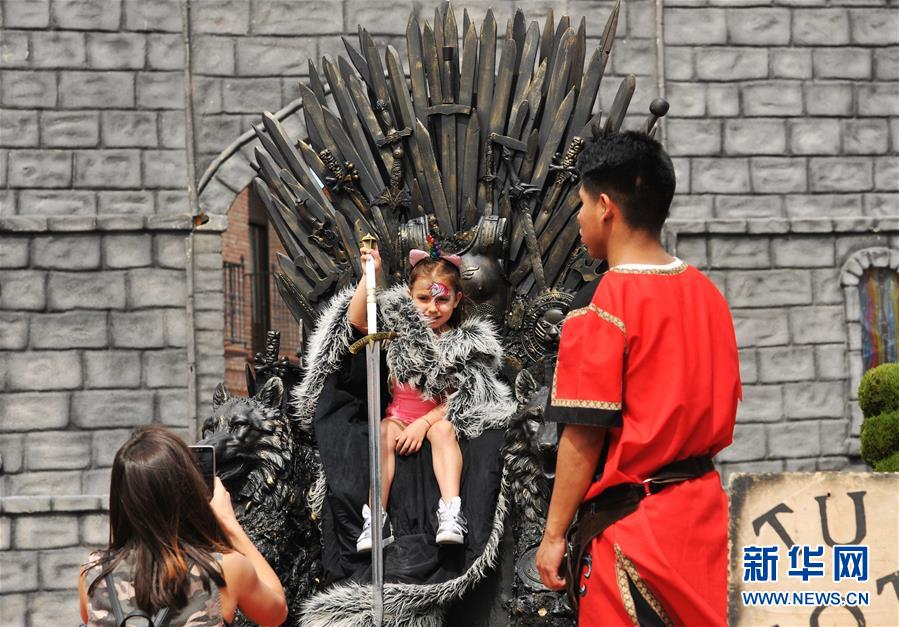 5月1日,在西班牙埃尔阿拉莫镇的中世纪主题集市上,一名小女孩在模仿《权利的游戏》的“铁王座”上拍照。新华社记者 郭求达 摄